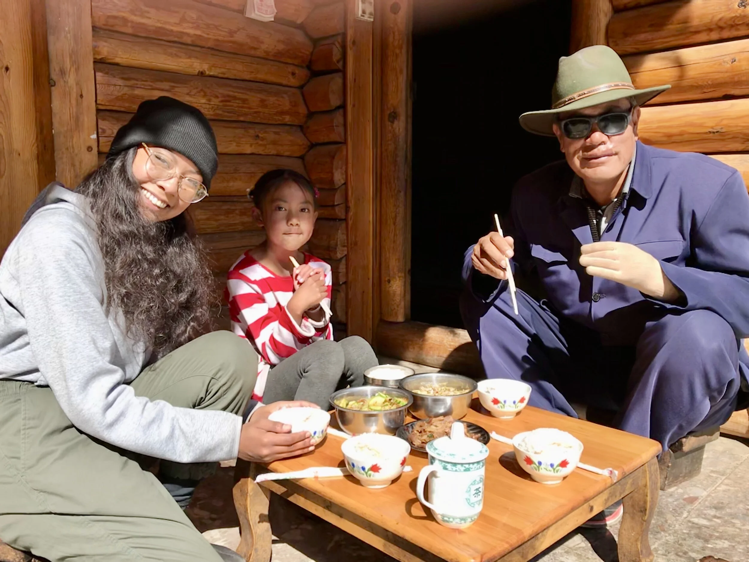 Cinematographer Kayla Briet at lunch with the innkeeper and his grand-daughter in Yunnan, China